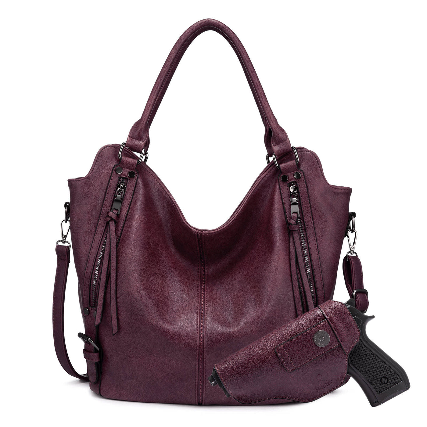 Premium PU leather hobo tote designed for women's lifestyle and travel brands seeking functional, waterproof carry-all bags. Features a detachable concealed carry holster with magnetic closure and fits 13.3-inch laptops for urban mobility. Customizable in color, logo, and size with OEM/ODM support for global market adaptation. MOQ 1 | Free sample available | Supplier provides SGS documentation.