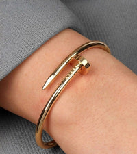 A bold twist on elegance, this gold-plated bracelet features a unique nail-inspired design that makes a powerful statement. Perfect for those who love modern, edgy fashion while keeping it classy. Ideal for daily wear or as a standout gift.